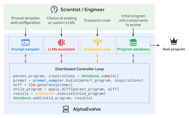AlphaEvolve is a coding agent by DeepMind for general-purpose algorithm discovery and optimisation, that often outperform human-crafted solutions. It combines the creativity of LLMs with automated evaluators.